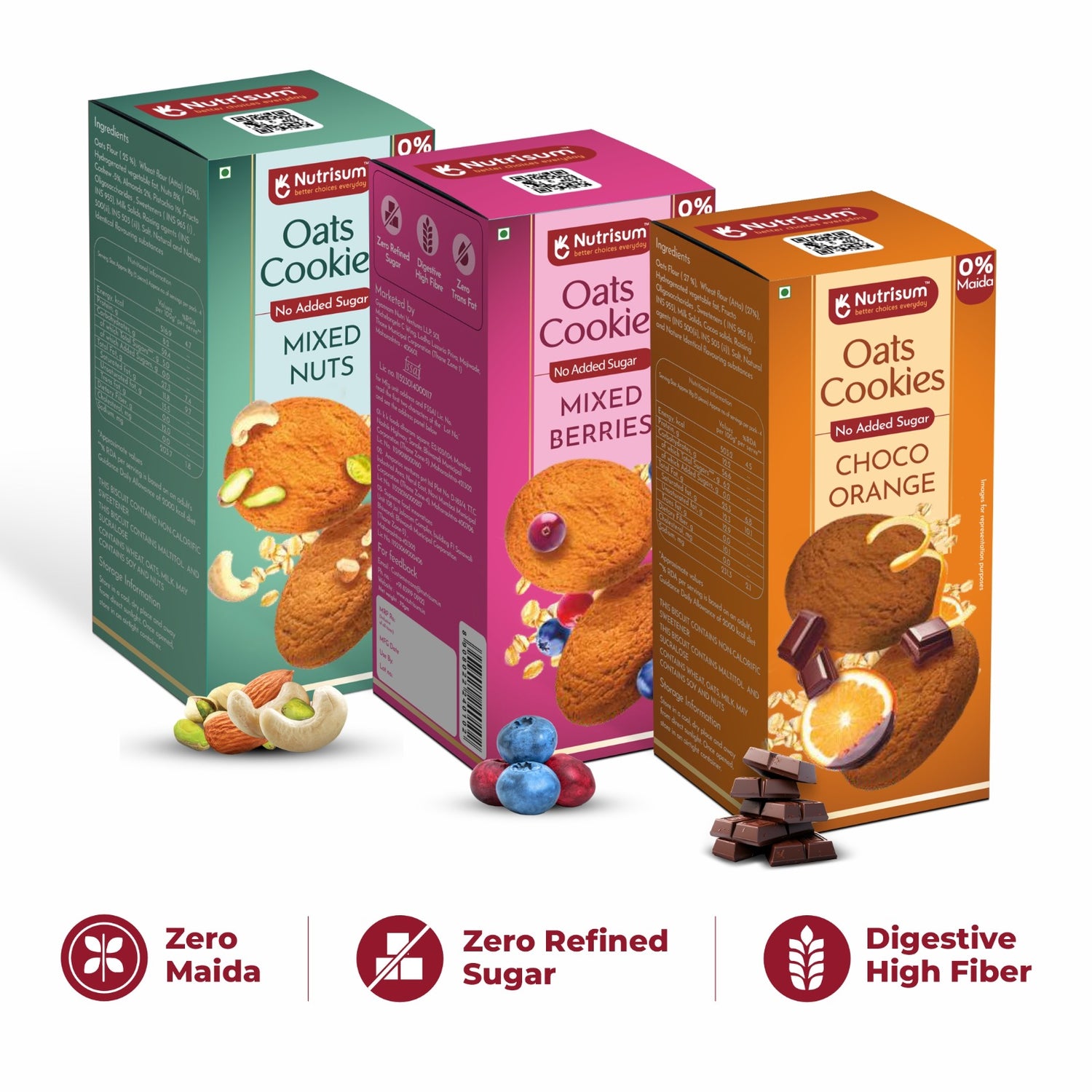 Indulge in our wholesome Oats Cookies, made with whole grains, zero trans fats, and absolutely no refined sugar. These crunchy delights are fortified with prebiotic fiber for a healthy gut, offering the perfect balance of nutrition and flavor. Available in three delectable flavors: