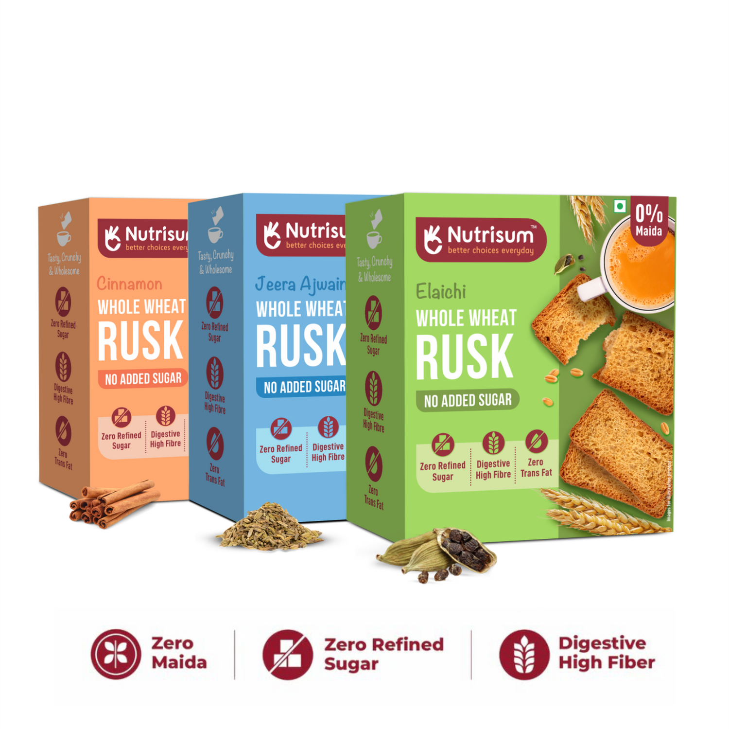 Experience the perfect crunch with our healthy rusks, made from whole grains and completely free of added sugar. Fortified with prebiotic fiber, these rusks support your digestive health while delivering a delicious, guilt-free snack. Available in three flavorful varieties: