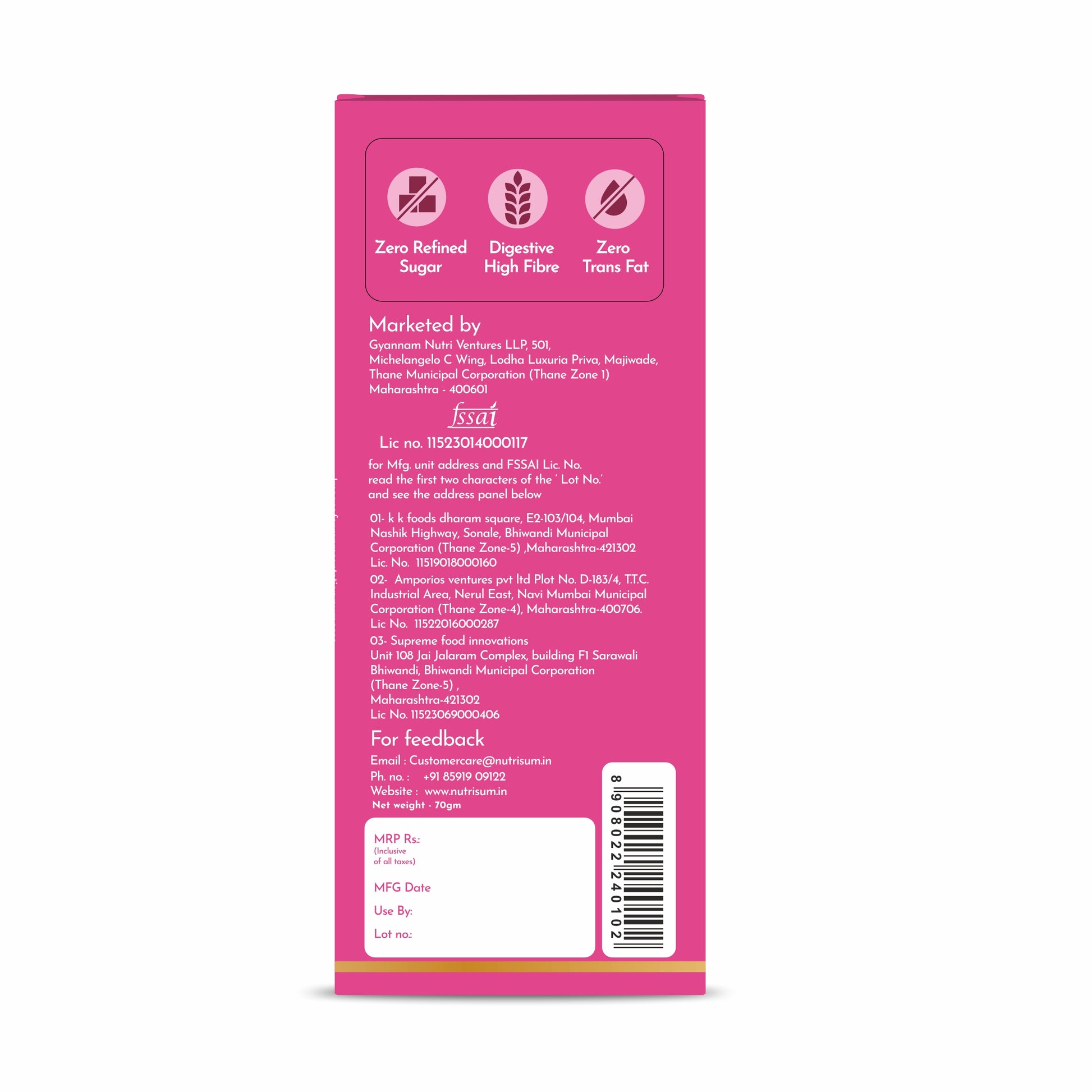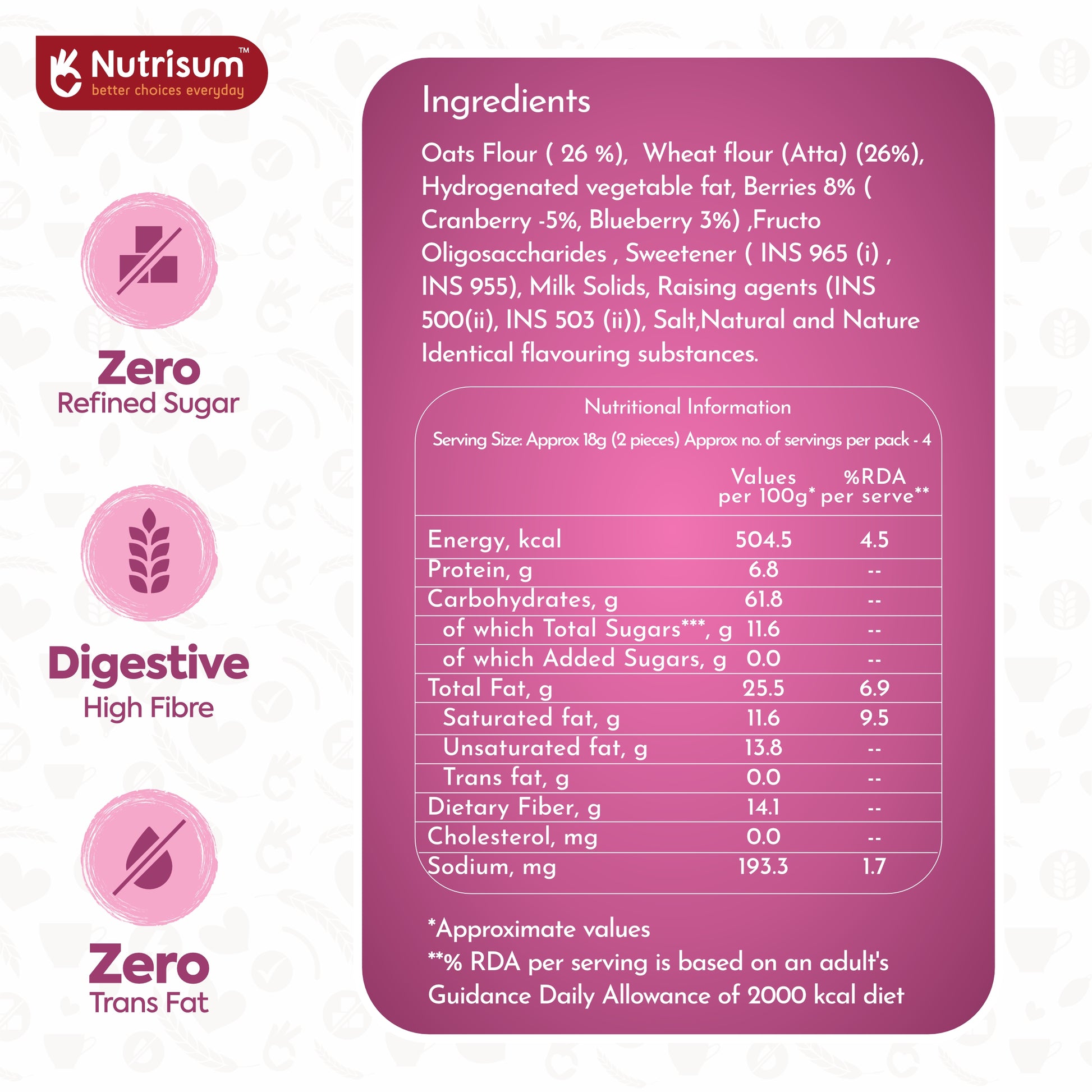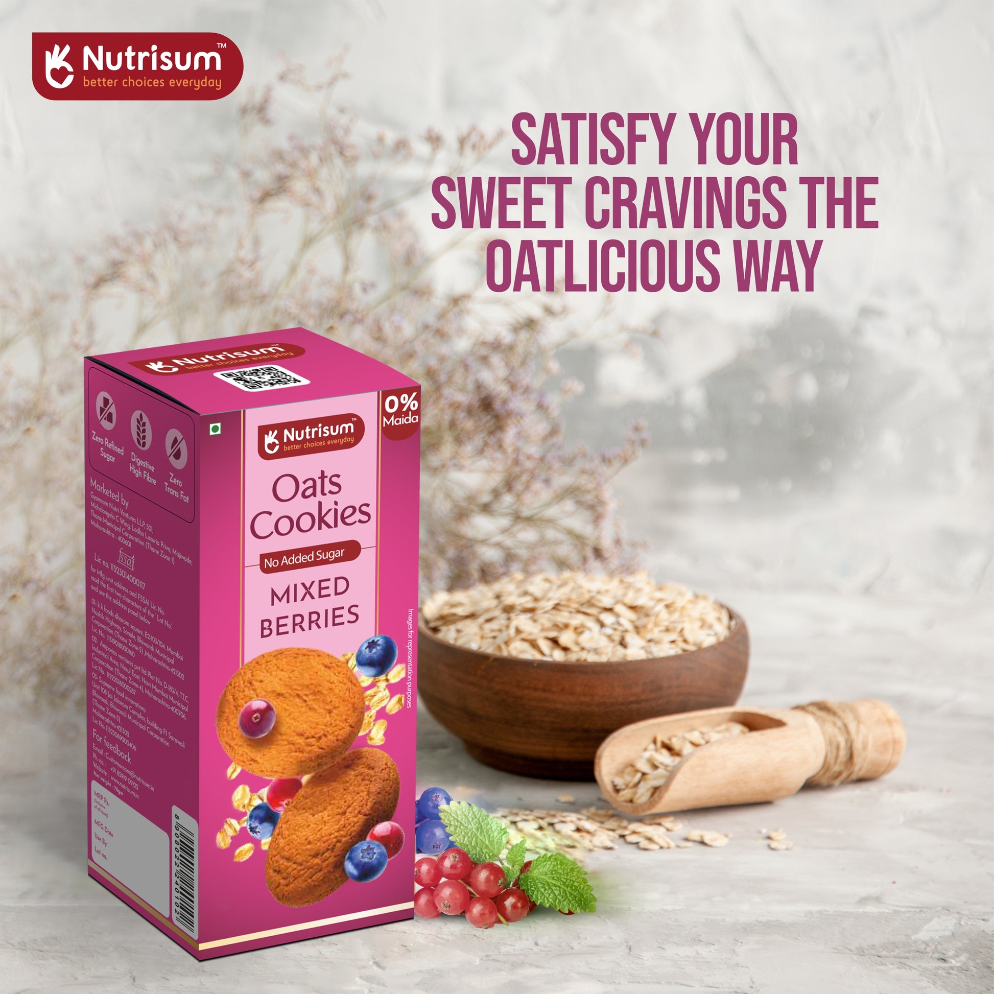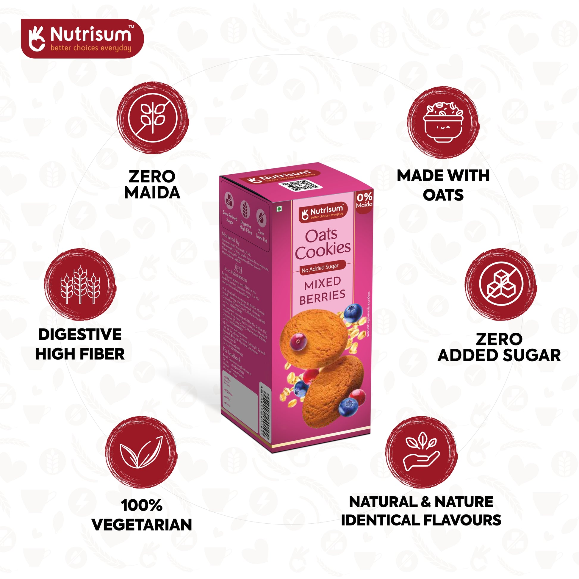 Delight in the flavorful and nutritious Nutrisum Mixed Berries Oats Cookies. Each 70 gm pack is filled with the goodness of wholesome oats and a medley of mixed berries, offering a perfect balance of sweetness and well-being. Ideal for a quick snack or a guilt-free treat, these cookies are a delicious way to satisfy your cravings while providing a boost of energy throughout the day.